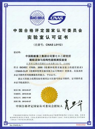 我所舰船流体与结构性能检测实验室的基础是舰船流体力学、结构性能等有关试验室。建所60多年来,我所已成为从事舰船、海洋工程等水动力性能、结构性能和安静性能试验检测的专业研究基地。拥有包括舰船快速性、耐波性、操纵性、水动力噪声等研究、试验所需的水池、风洞、水筒,从事实船性能检测的实船性能试验室,以及进行结构性能试验研究的配套完整的试验室群体和从事检测所需的设备和测试仪表,其整体规模和综合研究能力位居世界第三位。舰船流体与结构性能检测实验室二○○二年获得中国实验室国家认可委员会的认可,取得了国际互认的实验室认可证书(证书号:CNASL0112)。同时,舰船流体与结构性能检测实验室和已通过实验室认可与计量认证的中国船舶工业舰船总体性能试验检测中心(证书编号:2007000730W)、中国船舶工业金属结构试验检测中心(证书编号:2007000462W)为同一实体和同一套管理机构。