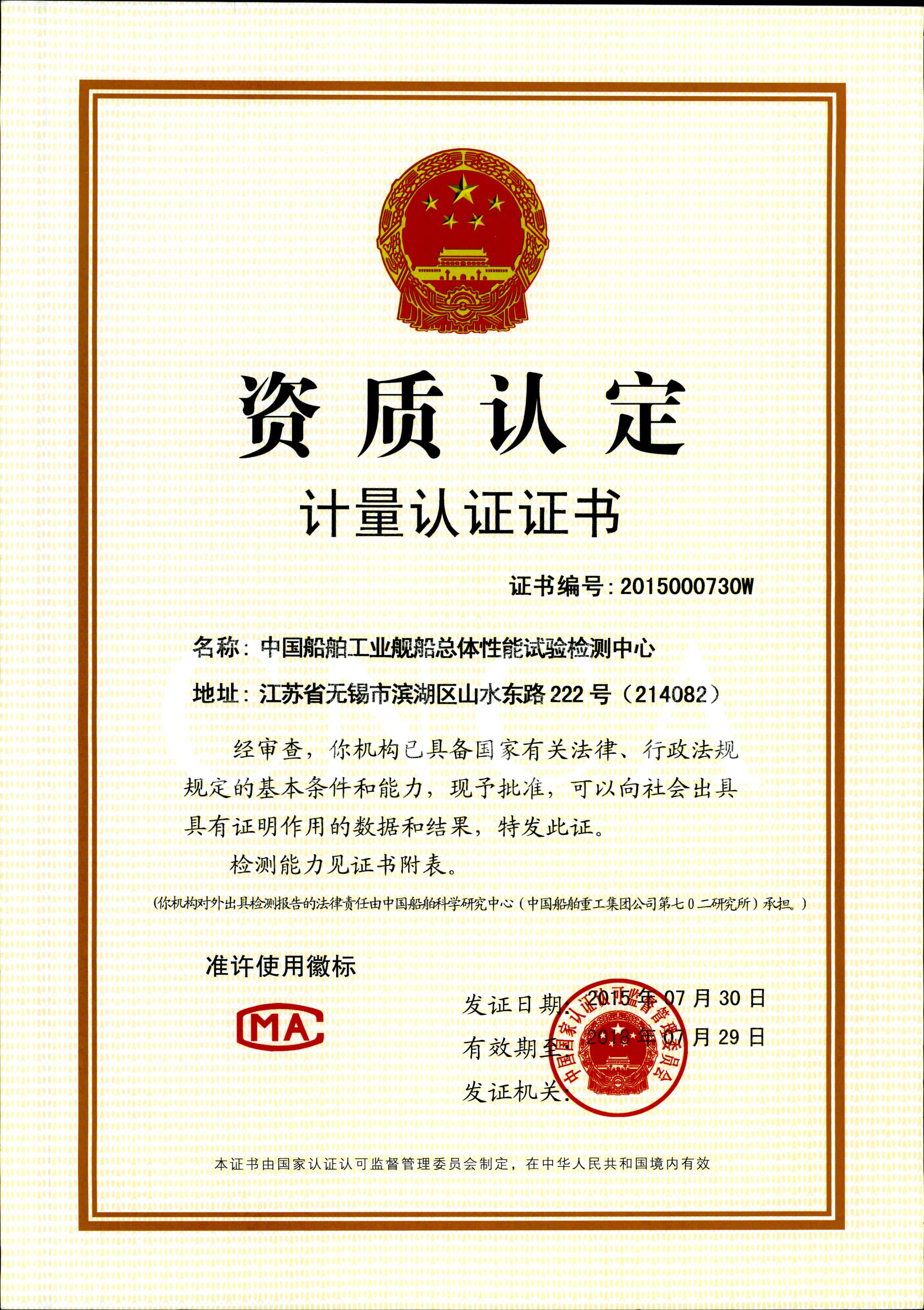 舰船总体性能试验检测中心下设深水拖曳水池试验室、推进性能试验室、耐波性水池试验室、低速风洞试验室、旋臂水池试验室、露天水池试验室、实船试验室(包括实船流体性能、实船结构性能)、水动力噪声试验室和空泡水筒试验室。拥有包括船舶快速性、耐波性、操纵性、水动力噪声等研究、试验所需的水池、风洞、水筒以及进行结构性能试验研究的完整配套的试验室群体和实船试验室,先后承担了我国自行研制的各类船舶、海洋平台等水动力性能的试验、研究和检测(包含模型与实船)。