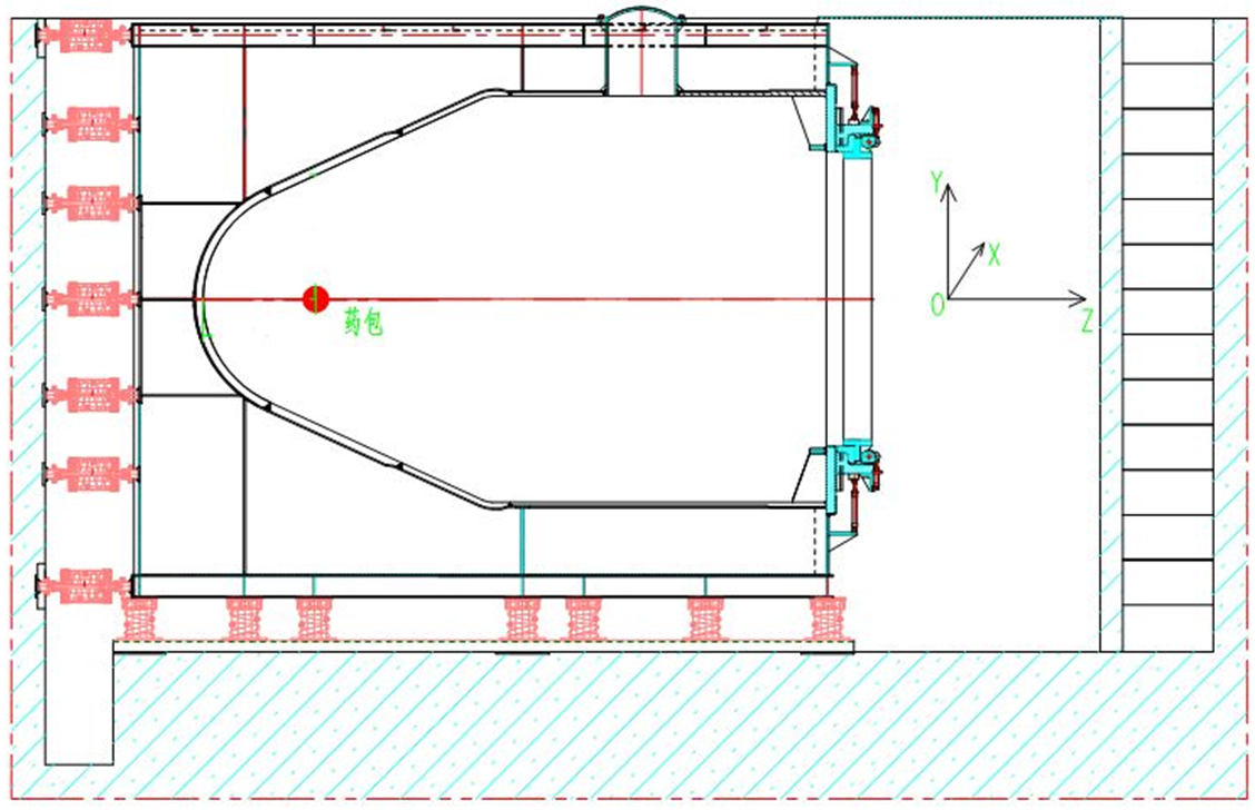 实验设施介绍:最大试验药量10kgTNT,可进行防爆门、防爆窗和舱壁结构的抗舱内爆炸性能试验和考核,模型最大尺度2.5m×2.5m。