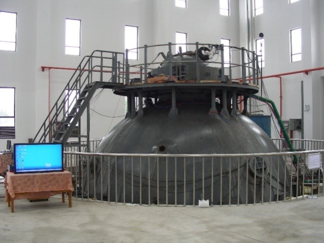 实验设施介绍:可在0~6MPa水压条件下进行水下爆炸试验,罐内直径7m,最大试验药量1kgTNT,并配备水净化系统、灯光照明系统、电测和光学测量系统。