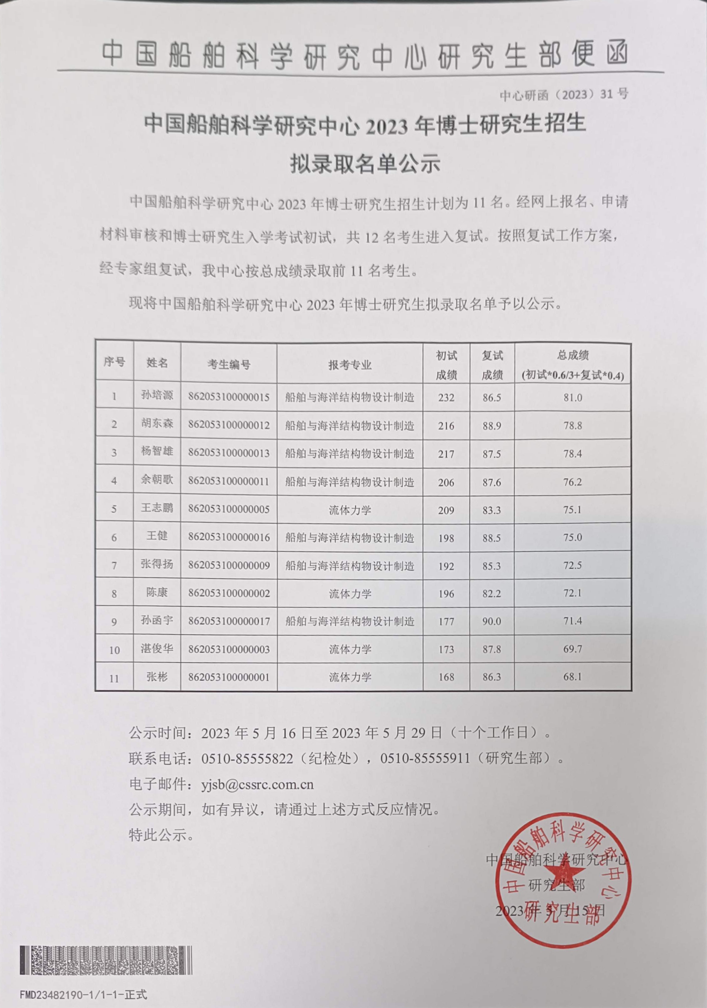 中国船舶科学研究中心2023年博士研究生招生拟录取名单公示