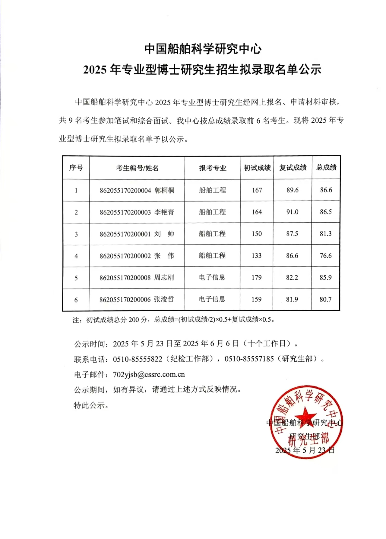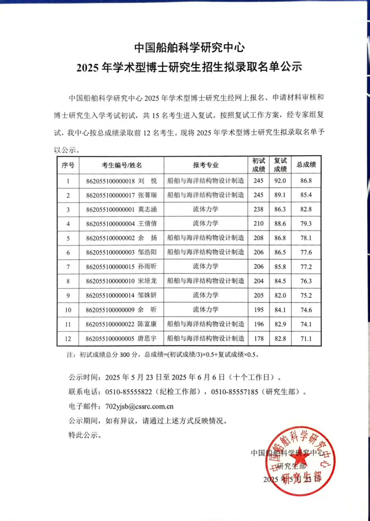 中国船舶科学研究中心2025年博士研究生招生拟录取名单公示